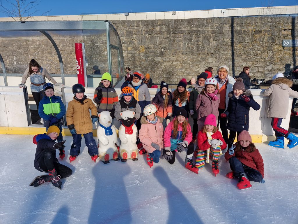 Am Mittwoch waren wir bei Kaiserwetter mit unserer Lehrerin Frau Heinrich und unserem neuen Praktikanten Nico auf der Eisbahn. Es hat uns sehr viel Spaß gemacht, auch wenn sich so einige blaue Flecken geholt haben. Sich das erste Mal auf so einer rutschigen Fläche mit dünnen Kufen fortzubewegen, ist gar nicht so einfach wie es ausschaut. Aber wir geben nicht auf und werden in der nächsten Saison fleißig weiterüben.